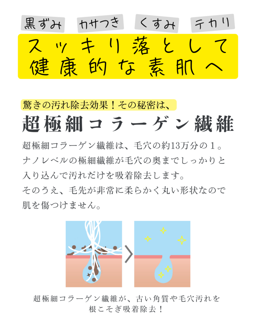 天然のコラーゲン繊維が肌の毛穴汚れやカサつきをスッキリ吸着除去します。